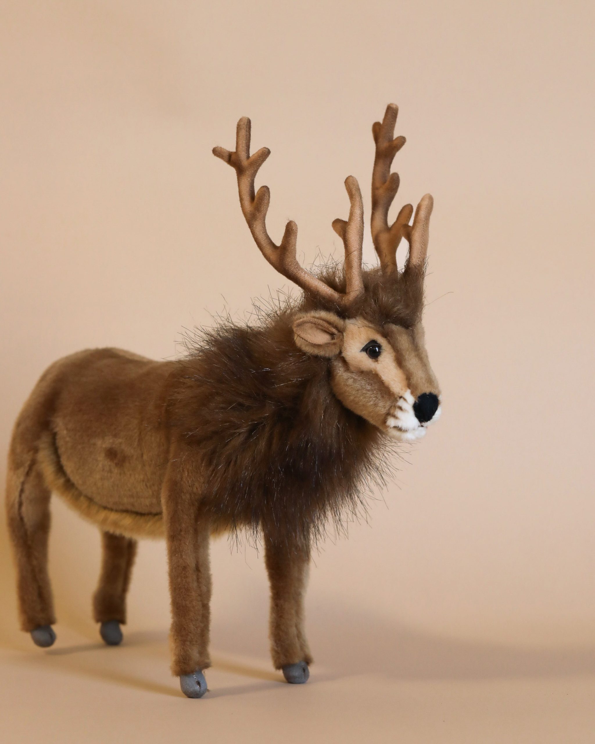 Artisans hand sew the animals “inside out”, an old world tradition that results in the mininization of seams, and their bodies are carefully “sculpted” to create “musculature” and “features” like movement in a walking or sitting position that are unique to each creature. On average, there are 42 separate pieces required to make each animal, that must be combined by a team of truly creative artists to create the distinctly realistic features that characterize HANSA animals. (Some animals have as many as 240 different parts!) Each animal is individually hand sewn, to give it a unique “personality”, there are more than 860 different fabrics and man-made furs from which the “coat” and “hides” are made, along with over 6000 sets of different eyes, whiskers, claws, noses, and related accessories allocated for creating these wonderful plush animals. Stuffing emphasizes careful attention to the placement of the highest quality man-made materials.