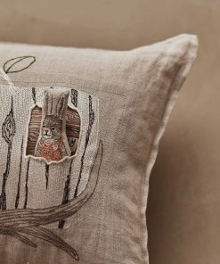 Our Aspen Log pocket pillow features three removable rabbit pals, each one holding an animal friend including a songbird, chipmunk and tabby cat. Take each one out of their pocket to reveal the detailed interior of their log home! Inside the cozy home is an armchair, vintage range and a tiny bed with a checkered quilt.
