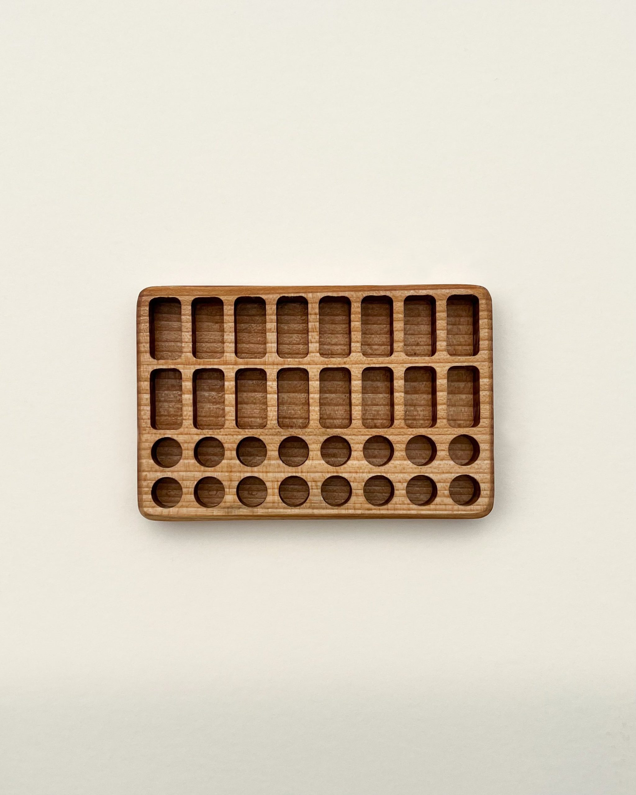This crayon holder is designed specifically for Stockmar sticks and includes 12 slots for sticks and 12 slots for blocks.