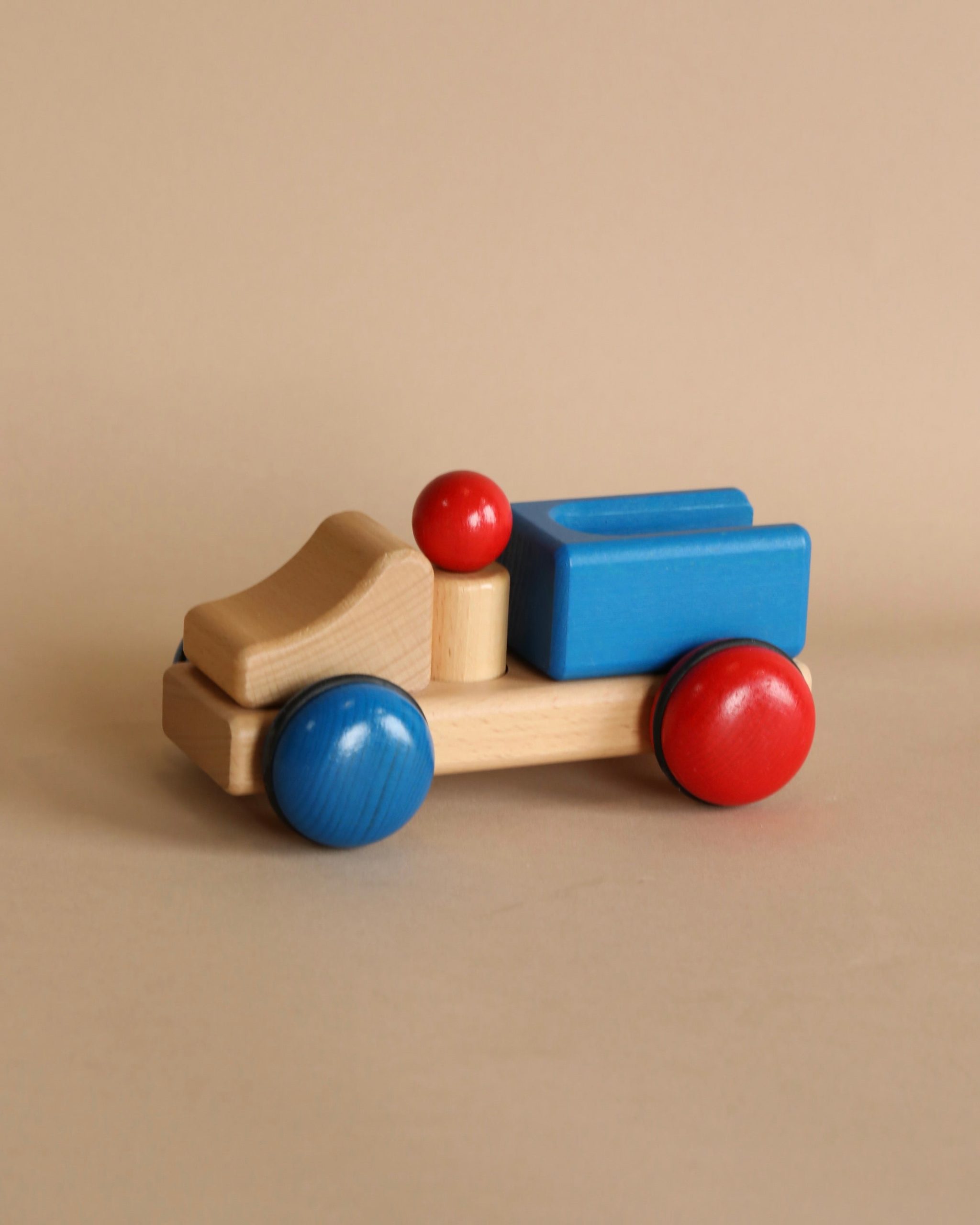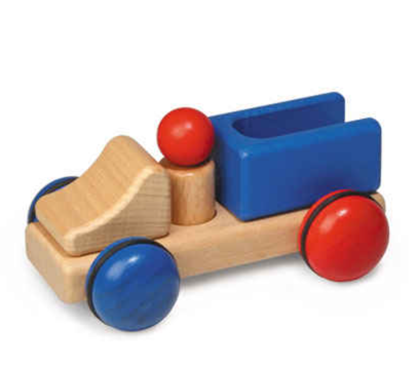 A colorful mini pickup truck by Fagus, with one removable peg figure. Perfect for small hands! The wooden toys are handcrafted in a workshop for the disabled using beechwood, with interlocking, doweled, and glued connections. No nails, screws, or staples are used.