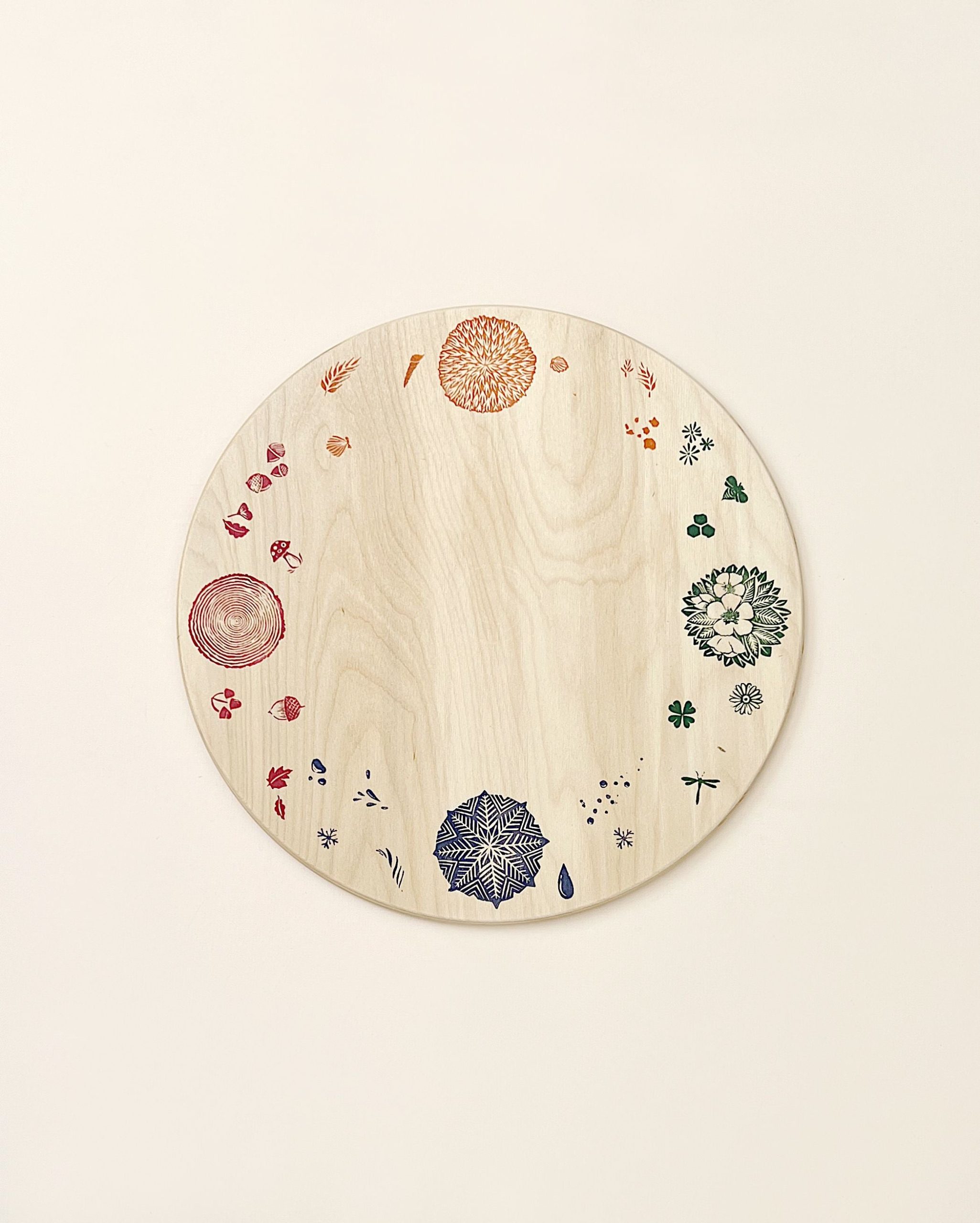 A round wooden platform stamped with images of the four season’s elements. This platform may be used as a complement for the Grapat perpetual calendar.