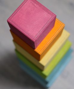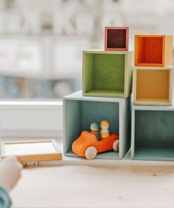 This set of large stacking boxes in pastel colors is an essential and versatile toy for the children: they can stack and sort the boxes by size and color, build with them, use it as doll house or car port, collect treasures etc. Plywood, non-toxic water based color stain