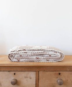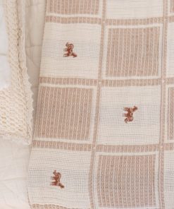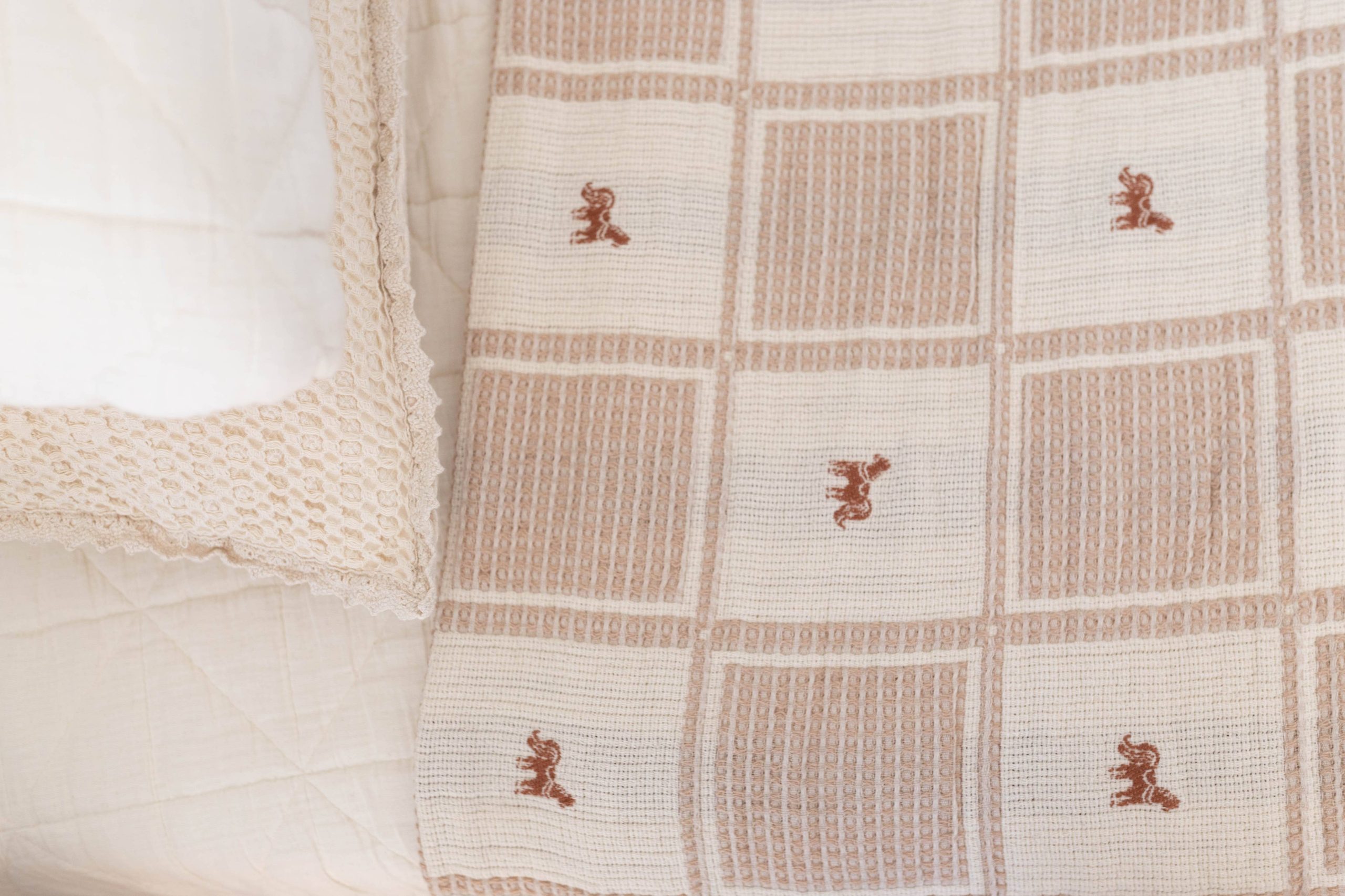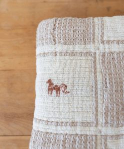 Detailed embroidered pony and crotchet trim milk and sand squares – featuring hazelnut ponies.