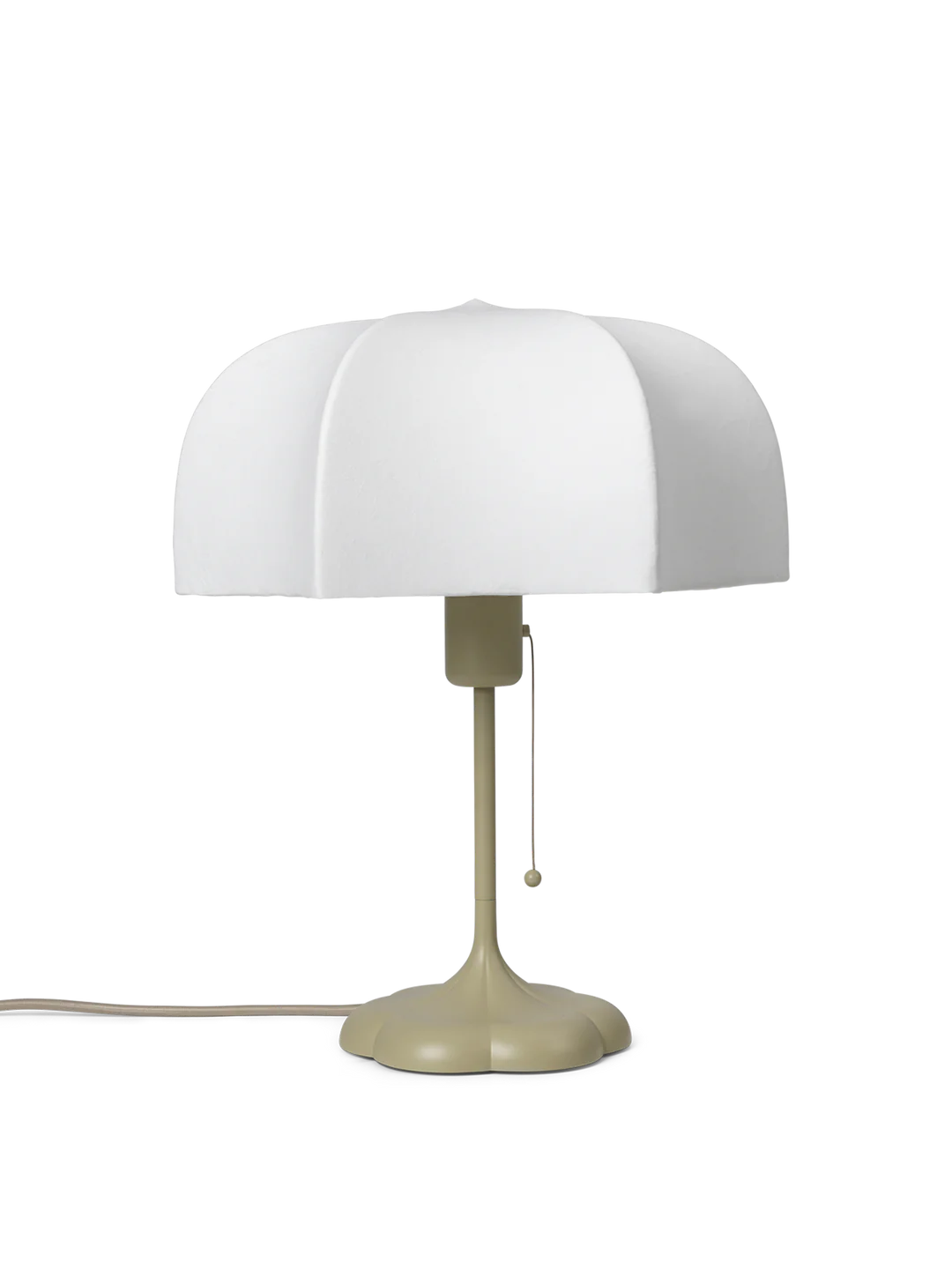 Material: Lampshade made of a steel structure with a sprayed-on polymer skin to softly diffuse the light. Powder coated casted aluminium base with E26 socket with a pull cord on/off switch and 2,6 metre fabric cable