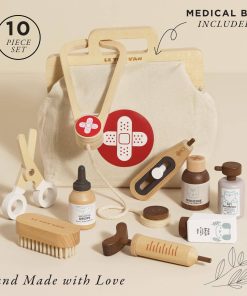 Our Animal Vet Set is the perfect companion for imaginary pet owners and animal lovers alike! This veterinarian-inspired set includes a vintage style storage medical aid bag, which is equipped with everything required to give any animal the best of care! Featuring a sleek walnut stain finish, the 10 accessories forming this set are unlike any others. Items included are; soothing paw balm, ear drops, medicine bottle, pet shampoo, stethoscope, dressing scissors, a syringe and a soft brush. Bring the world of career-based role play into any home with this perfect play set. Great for developing cognitive skills, dexterity and hand-eye coordination.