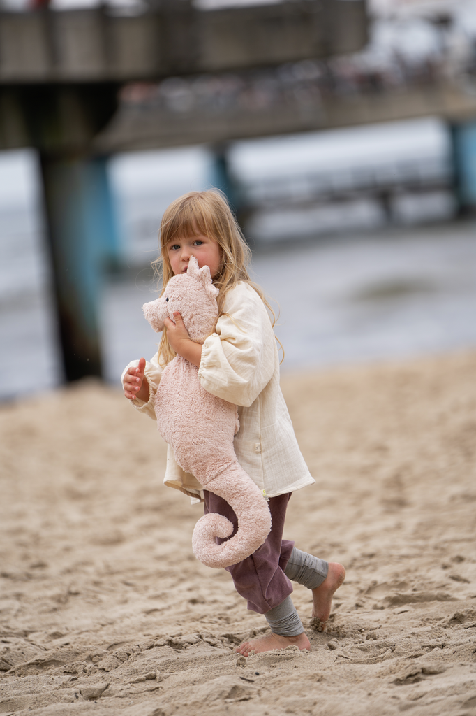 The seahorse from Senger Naturwelt’s “Sea Creatures” collection is more than just a cuddly toy—it’s also a large grain pillow that provides warmth and comfort. Made from sustainable, GOTS-certified materials from Germany and Europe, it impresses with its quality and environmental awareness. This seahorse is not only a loyal companion for children and adults, but also a stylish decorative piece for your home.