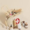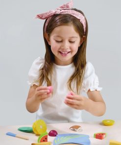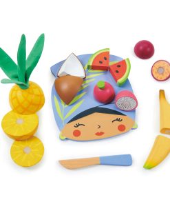 A tropical themed wooden cutting board and little blue knife. A pineapple in 3 parts, a watermelon, a coconut, a banana, a passionfruit and a dragon fruit in 2 parts. Attached with velcro for easy cutting. Netting bag for tidying away included.