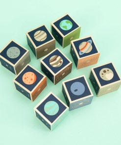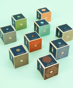 Mercury. Venus. Earth. Mars. Jupiter. Saturn. Uranus. Two debossed sides feature the planet’s symbol, name, and number of moons. The four printed sides reveal a planet illustration, diameter, location, and distance from the sun. This 9 block set honors all 8 planets in our solar system; plus a bonus dwarf planet, Pluto.