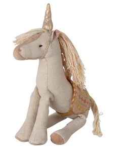 A magical story is about to begin. With this unicorn made in colorful tones and a golden horn, there are many stories to tell. The unicorn comes with a saddle for a comfortable ride.